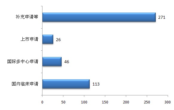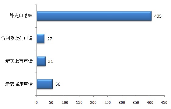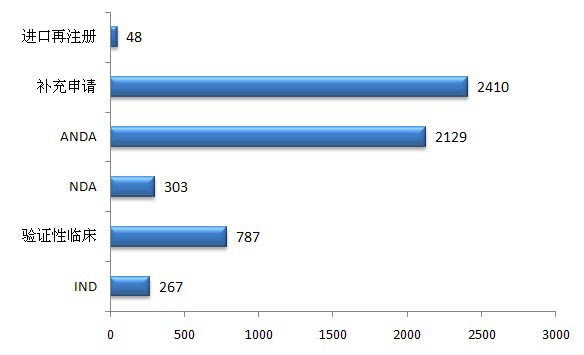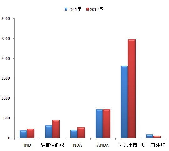 2012年,化药新申请以受理号计共5944个。其中新药临床试验申请(IND)包括注册分类1、注册分类2和国际多中心临床试验申请;验证性临床为注册分类3和4的临床试验申请;新药生产上市申请(NDA)为完成临床试验后的生产上市申请;仿制及改剂型申请(ANDA)为注册分类5和6生物等效试验申请和生产上市申请;补充申请系已上市产品的变更申请(其中,以补充申请形式提交的创新药Ⅱ、Ⅲ期临床试验申请,已纳入IND统计)。