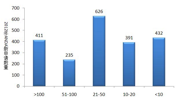 图4显示,2012年新申报的ANDA申请共2095个(按受理号计,不包括辅料)。已有批准文号20个以上的药品,仍有1272个申请,占2012年全年ANDA申报量的60.7%;已有批准文号10个以内的ANDA申请仅占其总申报量的20.6%。此数据显示,仿制药重复研发、重复申报现象依然严重。