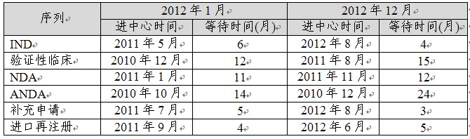表5显示,2012年,举中心之力,力保创新药临床试验申请的审评,使审评等待时间略有缩短并基本维持在4个月左右;上市后补充申请的等待时间也从2012年初的5个月,降至2012年底的3个月;但是,ANDA的等待时间从年初的14个月延长至年底的24个月。同时,NDA和验证性临床试验申请的等待审评时间也有所延长。