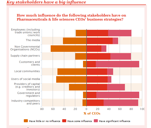 制药和生命科学公司需要回应病人的需求,但他们也要理解和处理政府和监管者的期望。我们调查中的CEO们对这种平衡深有体会,94%的CEO表示消费者和客户会影响他们的策略,同时94%的人说他们会将政府和监管者考虑在内。