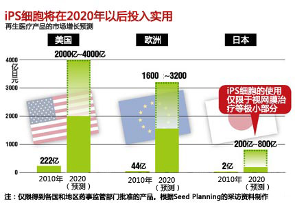 调查公司Seed Planning估算,到2020年,全世界再生医疗产品的市场规模最大将接近1万亿日元,是2010年的30倍。2010年仅为2亿日元的日本国内市场预计将激增到近1000亿日元,这依靠的是环境的快速完善,其中包括了日本政府积极提供研究经费补助、医疗产品审批速度的加快以及规定再生医疗手续的新法律的制定。