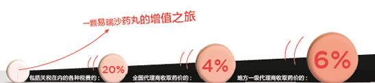根据《21CBR》记者的调查,在中国,服用易瑞沙治疗的每月费用大概在1.5 万元到1.8 万元之间。每颗约550元的易瑞沙,在中国的价格递增过程如下:包括关税在内的各种税费约占成本的20%;给全国代理商和地方一级代理商分别占4% 和6% 左右; 从医院或者医院指定的药房出售时溢价约15%。尽管有政策规定,超过500 元单价的药物在医院只能加价75 元,但各地在实际操作中的溢价空间并不相同。