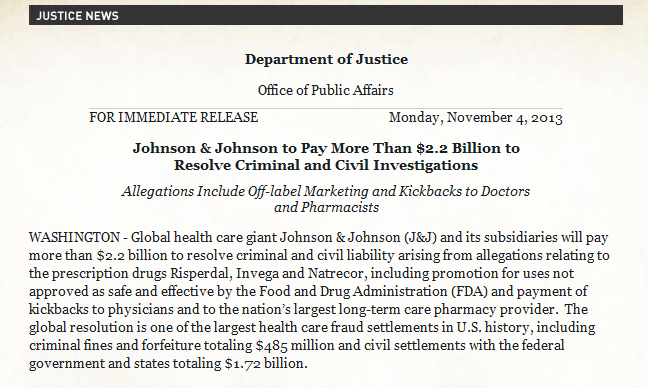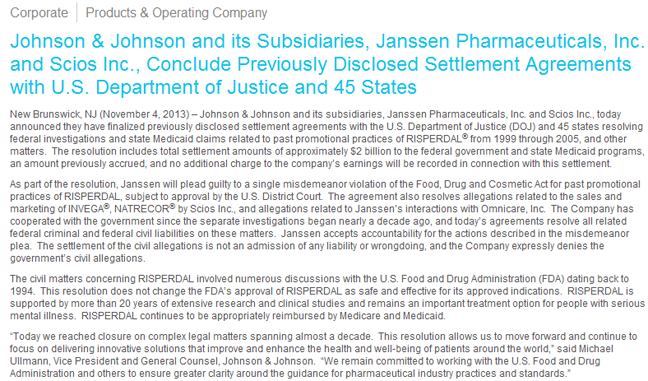强生在官方称网站承认了这一事实,并称已为应对诉讼结果做好了准备,此次罚款不会对公司的盈利状况造成影响。但强生在发布的新闻仍在淡化美国食品和药物管理局(FDA)及美国司法部对其做出的指控。公司副总裁兼总法律顾问迈克尔•乌尔曼说,强生公司已经就十年来复杂的法律事务同联邦政府达成了协议,“从而能让我们继续专注于提供创新的解决方案、改善和加强世界各地患者的健康和福祉。”