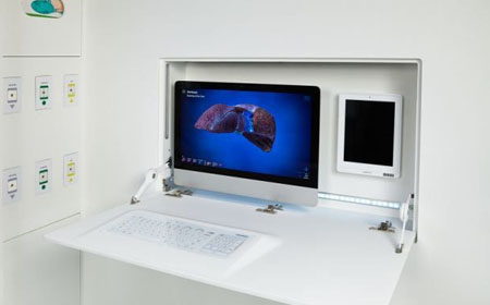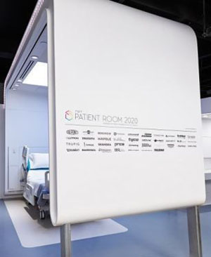 “2020病房”是各种技术、材料和即插即用功能高度整合的杰作,它既包含了一般病房常规设备,又有各种旨在提高病人舒适度或医护人员工作效率的全新技术。例如“病人环带”从床头墙到天花板再到床尾墙把病床围绕了起来。床头墙中埋设了监测生命体征的仪器,还有氧气罐及其他必需的设备。病床上方的面板含有由病人控制的照明设施。床尾墙上装了一个显示器,它能用于和医生进行视频咨询,调看医院信息,还可以观赏娱乐节目——所有这些功能都通过一台平板电脑控制。护理技术则包括一个洗手台,用于追踪仪器设备的内置无线射频识别(RFID)技术,以及用于降低医源性感染风险的仿紫外线消毒台。