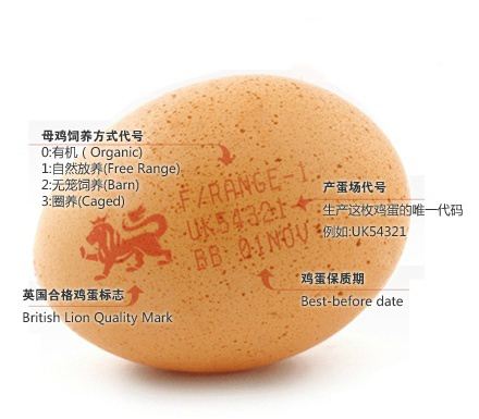 初到英国的人会发现一个怪现象,英国超市里的鸡蛋蛋壳上印着一个狮子的标记。对英国人来说,狮子代表着质量,狮像标记中有该蛋最佳食用期限、生产农场代码、以及产蛋的母鸡是笼养的、圈养的、放养的、还是有机食品喂养的等信息。据估计,英国80-90%的鸡蛋都是狮子蛋。