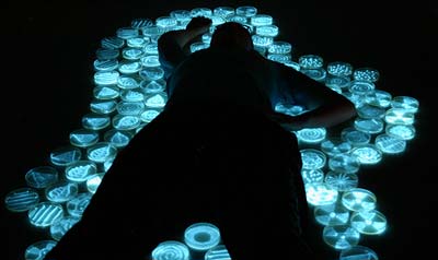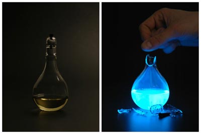 就像艺术片里一定有隐喻一样,生物艺术作品里也会有所要表达的内容,像上面这个就是对开源合成生物学的探讨。下面这个“Blood lamp”得滴入血液到灯泡液体里,灯才能亮,显然,它在表达能源主题。