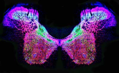下图拍的是老鼠的脊髓,不同荧光颜色代表谷氨酸和一氧化氮合成的酶,目的在于让人更好的理解谷氨酸和一氧化氮在神经系统之间的交互,以及它们如何导致心血管疾病。