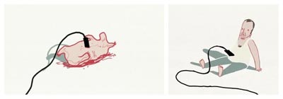 如果这些你看着觉得呼吸正常,那下面这个名为“life support”的“人与动物共生系统”你是否能接受呢?这个场景是在假设,那些需要器官移植的人,可以在不取动物性命的前提下,共用他们的器官,只是有多少人能忍受这般同吃同睡同行的“亲密生活”呢?