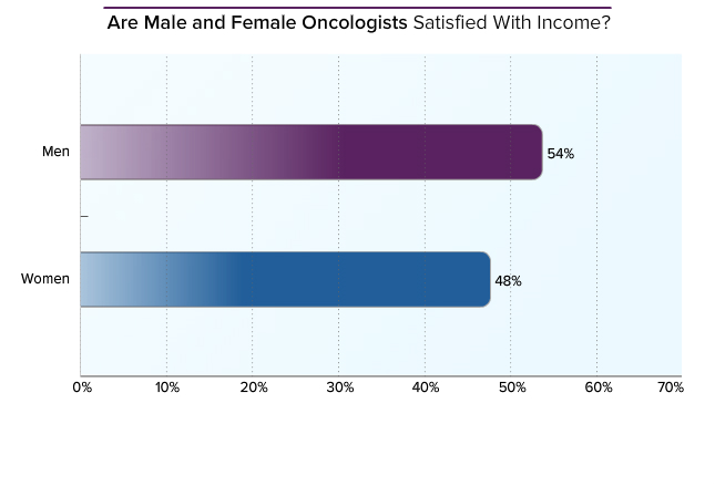 因为女性肿瘤医生的收入少于她们的男性同行,所以她们比男性肿瘤医生满意度低也不足为奇(女性与男性的满意度分别为48%和54%)。
