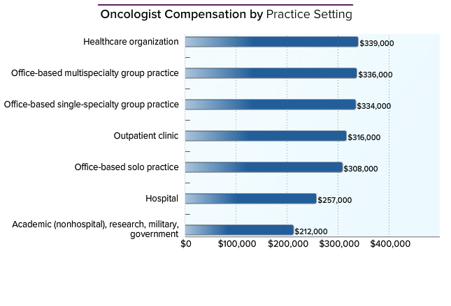 在医疗机构工作的肿瘤科医生收入最高(33.9万美元),而在学术机构、研究所、军队及政府相关部门最低(21.2万美元)。