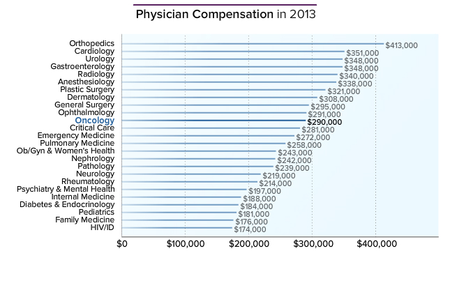 在2014年薪酬报告中显示,肿瘤科医生的收入落在中等偏上的位置,平均收入约29万美元。骨科仍然是收入最高的,其次是心脏科医生,泌尿外科和胃肠病医生并列第三。