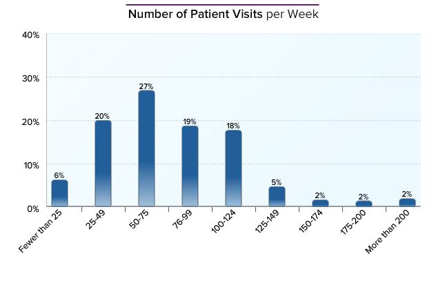 约47%的肿瘤科医生每周看病人的数量在25-75人,而37%的肿瘤科医生会看76-124人,每周超过125人次的肿瘤科医生占10%。