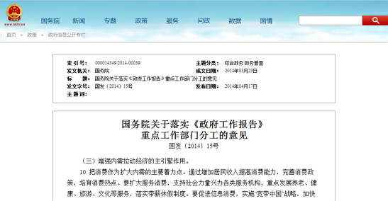 意见指出:“把消费作为扩大内需的主要着力点。通过增加居民收入提高消费能力,完善消费政策,培育消费热点。要扩大服务消费,支持社会力量兴办各类服务机构,重点发展养老、健康、旅游、文化等服务,落实带薪休假制度。要促进信息消费,实施“宽带中国”战略,加快发展第四代移动通信,推进城市百兆光纤工程和宽带乡村工程,大幅提高互联网网速,在全国推行“三网融合”,鼓励电子商务创新发展。维护网络安全。要深化流通体制改革,清除妨碍全国统一市场的各种关卡,降低流通成本,促进物流配送、快递业和网络购物发展。充分释放十几亿人口蕴藏的巨大消费潜力。