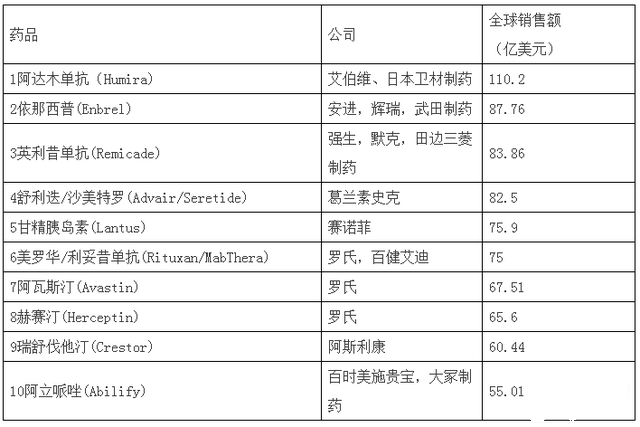 此外,罗氏有3种药物在最畅销药物之列,在利妥昔单抗之后的是治疗直肠癌的药物阿瓦斯汀和乳腺癌治疗药物赫赛汀。除了治疗类风湿类和癌症外,葛兰素史克治疗哮喘的药物沙美特罗,赛诺菲治疗糖尿病的药物甘精胰岛素,阿苏利康的降胆固醇药物瑞舒伐他汀,武田制药和百事施贵宝共享的抗抑郁药物阿立哌唑也处于最畅销药物之列。