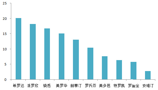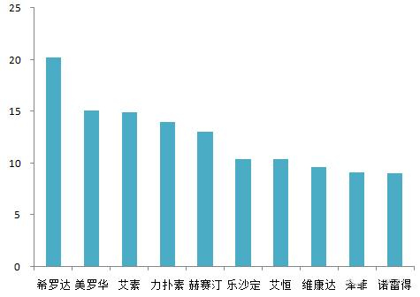 在这前7个品牌中,泛生舒复与罗氏芬的同比增幅依然领先于其他品牌,分别为32.6%和24.7%,而且除海口制药厂的产品(23.8%)外,其他品牌的同比增幅均为在10%以下。