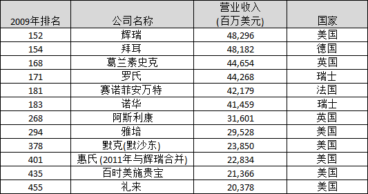 2009年财富500强制药公司排名