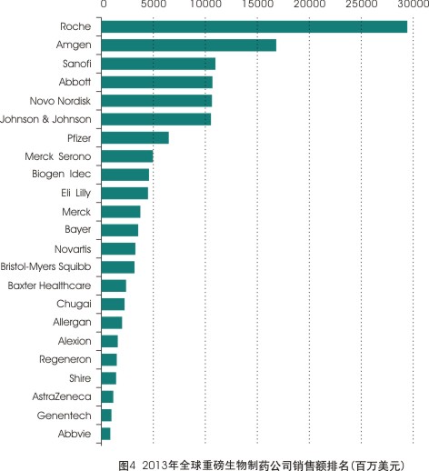 在全球重磅生物制药公司中,罗氏以294亿美元的销售额雄踞2013年榜首,较2012年增长了5%,增速有所放缓,销售总额远远超过了随后的安进和赛诺菲。不过赛诺菲整体增势喜人,虽然已经闯入前三名,但仍然保持17.5%的增速,而第四名雅培同样处于高速增长的轨道,安进现有排名在未来可能受到来自赛诺菲和雅培的威胁。诺和诺德和强生分居第五和第六名,但强生增长强劲,2013年销售额增长了近13.4%,2014年有望超越诺和诺德挤进前五名(见图4)。
