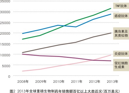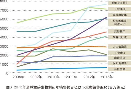 重磅生物制药可以划分为TNF抗体、癌症抗体、病毒抗体、促红细胞生成素、促卵泡激素、干扰素α、干扰素β、粒细胞集落刺激因子、酶替代疗法、人生长激素、炎症抗体、眼科用抗体、胰岛素及其类似物、重组凝血因子等几个大类,TNF抗体类以316亿美元三年蝉联冠军,其次为癌症抗体、胰岛素及其类似物、炎症抗体,成为生物制药领域的新“四大金刚”(前四大金刚:人胰岛素、人生长激素、干扰素、促红细胞生成素),虽然前四类仍然维持着高增长态势,但促红细胞生成素已风光不再,流放出了五强,价格逐年下降可能是其销售总额逆势下降的原因;另外人生长激素、干扰素市场均出现不同程度的萎缩,干扰素α下滑超过20%。