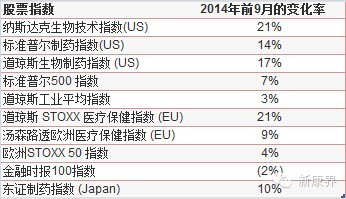如下表,在过去的几个季度中,大盘指数已经清楚的表明了大型制药公司股票的表现。尤其值得注意的是美国纳斯达克生物技术指数和欧洲道琼斯Stoxx医疗保健指数今年均创下了21%的涨幅。