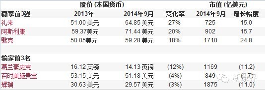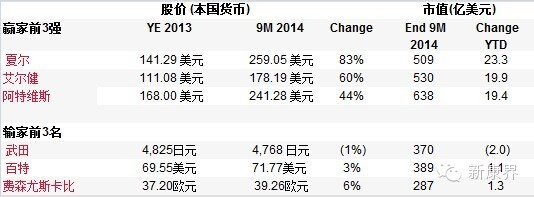 表 2014年前9月,大型制药公司的顶级赢家和输家