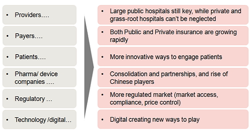因此,在获得这些调研结果后,我们需要思考:新兴的产业以什么模式进入市场?进入市场会带来哪些变化?怎样以合理的价格进入市场?怎样成为政府的合作方?如何与价值链方的商业伙伴进行合作?如何吸引人才和留住人才?如何抓住数字化医疗趋势?