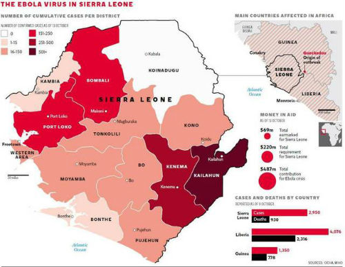 科伊纳杜古位于塞拉利昂北部山区,是塞国14个区当中面积最大的一个,那里的居民约有26.5万人,主要从事农业和金矿业生产。从地图中可以看出,科伊纳杜古的地理位置相当不妙:它置身于此次疫情的重灾区塞拉利昂,而且毗邻埃博拉疫情的发源地几内亚。在这样的风险之下,这里成为疫病横行之地也丝毫不会让人感到奇怪。然而在本月中旬之前,科伊纳杜古都保持着0感染的记录,截止目前也仅发现了两名埃博拉感染者。这一状况不可不称之为奇迹。