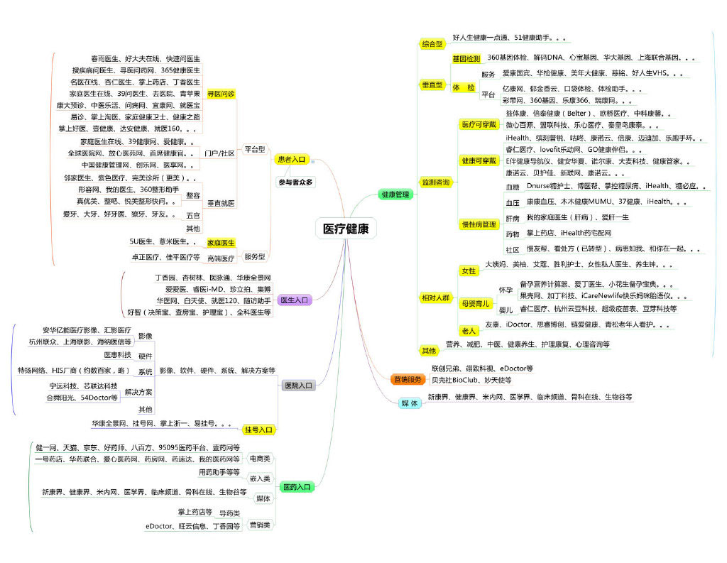 本图是根据公开资料进行不完全统计后画出的思维导图,意图对目前中国的移动医疗领域做出分类。