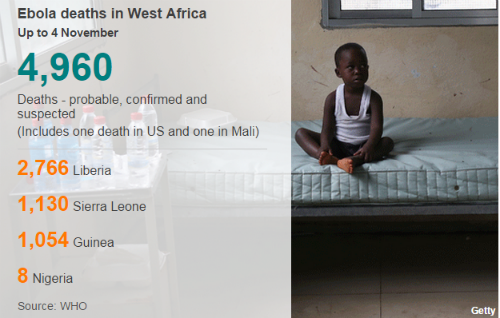 据世界卫生组织11月7日公布的统计数字显示,截至11月4日,全球8个国家中有近5000人因感染埃博拉病毒而死亡,感染人数为13268人。埃博拉病毒感染和致死人数最多的是几内亚(1054人)、利比里亚(2766人)和塞拉利昂(1130人)这三个非洲国家,死亡4950人,感染13241人。