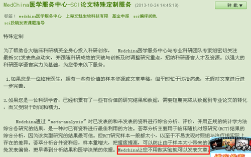 一篇写于2013年10月24日、名为“MedChina医学服务中心-SCI论文特殊定制服务”的博文中,则赫然写着“MedChina通过‘meta-analysis’对已发表的和未发表的资料进行综合分析、评价,并用正规的统计学方法综合各研究的结果……Medchina让您不用做实验就可以发表文章”。