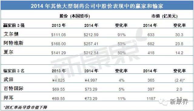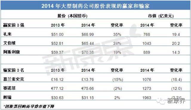 2014年,仅表现最好的三只大型制药公司的股票就为他们的市值增加了540亿美元,而礼来就是其中的领衔者。但是,与2013年伊始不同,这次也有一些大型制药公司的股票遭到了损失。除了传统意义上的大型制药公司之外,2014年生物制药股市情况更加乐观,不但没有一家大型制药公司的股价损失创造记录,同时生产率提高、并购活动和投机提升。
