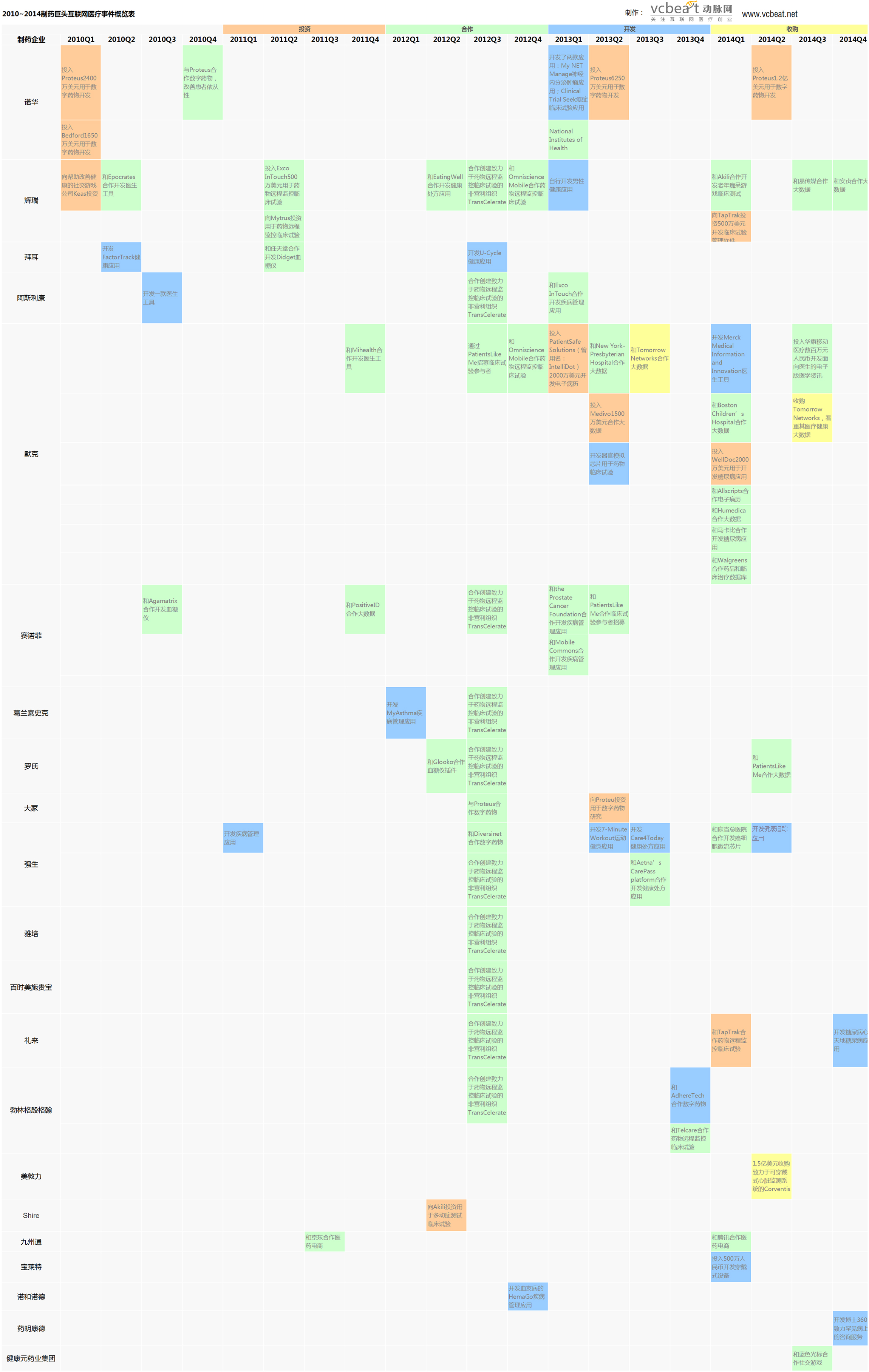 另其余小分领域涉及的有:穿戴式设备、健康处方应用、医生工具、电子病历、药品和临床治疗数据库、医学资讯、医药电商,涉及面较广,可看出制药巨头们正向互联网医疗多元化尝试。