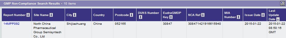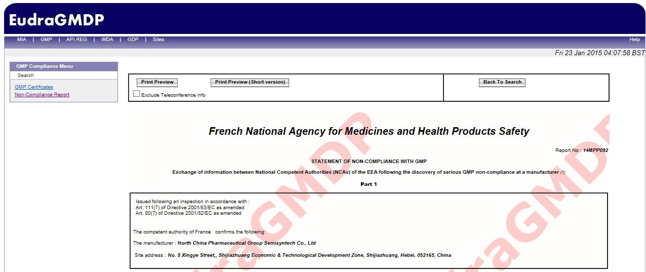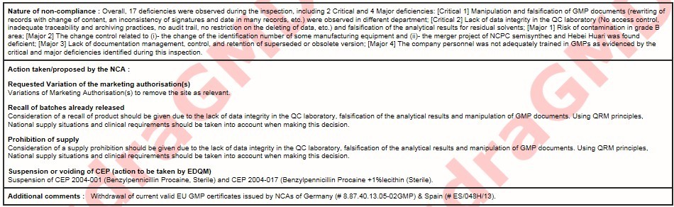 这是由法国药监局发出,因为位于石家庄的华北制药在欧盟相关检查中出现不合格的现象,因此,其欧盟的相关GMP证书被收回。