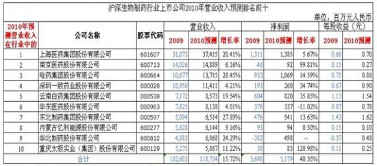基于以上信息及对上市公司财务数据的分析和判断,我们认为沪深生物制药行业10大上市公司,2010年的整体业绩将表现优异。