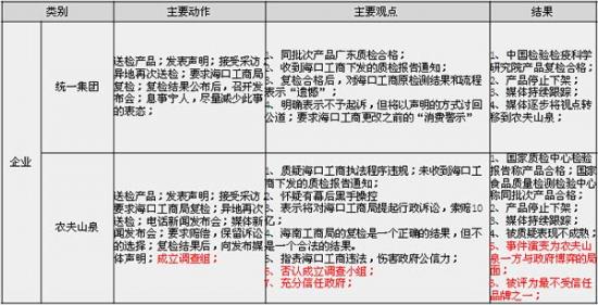 编者按 2009年11月,海南省海口市工商局发出消费警示,表示在对该市部分批发市场、商场、农贸市场、超市等销售的各类饮料食品进行抽样初检后,发现农夫山泉广东万绿湖有限公司生产的30%混合果蔬(生产日期:2009年6月27日,规格:500毫升/瓶)、农夫山泉广东万绿湖有限公司生产的水溶C100西柚汁饮料(生产日期:2009年8月16日,规格:445毫升/瓶)、统一企业(中国)投资有限公司生产的蜜桃多汁(生产日期:2009年8月22日,规格:250毫升/瓶)中成分超标,超标的成分是总砷。海口市工商局的消费警示还表示,上述结果经过了海南省出入境检验检疫局检验和海口市卫生防疫站复检证实。消息一出,统一和农夫山泉深陷“砒霜门”的新闻遍布了各大门户网站。