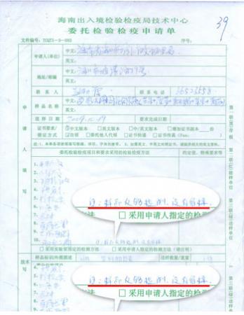 海南出入境检验检疫局技术中心委托检验检疫申请单原件扫描
