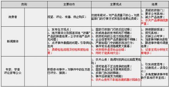 媒体在本次事件中充当了重要的角色,从最初的质检曝光、夸大概念、质疑企业、质疑工商机构、到现在的跟踪事件、主观判断分析等行为看来:媒体是危机的助推剂,如果没有舆论参与,危机对企业的声誉、生意的影响是非常有限的。