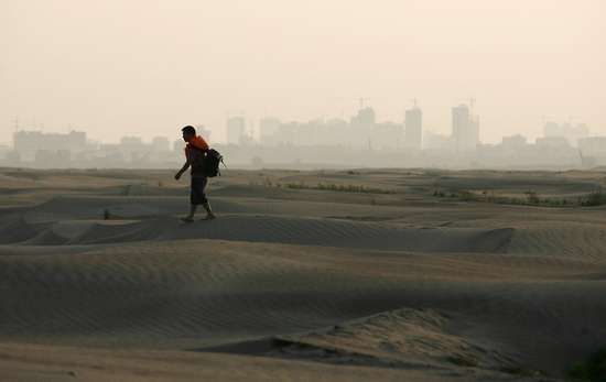 一名行人走过长江武汉段的河床。受持续干旱影响,长江水面不断下降,武汉段裸露的河床如同沙漠般干涸,武汉东边的鄱阳湖、西边的洞庭湖同样水位下降, 湖床上长满了草,变成一片片草原。(图)