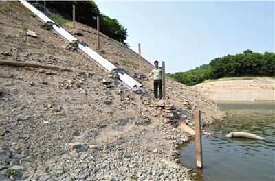 舟山虾峙水库干涸见底,自来水厂用于取水的管道已高于水面,无法取水。