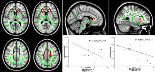 更重要的是,研究人员发现网瘾患者左侧胼胝体膝部损伤程度与其焦虑程度显著相关。此外,网瘾患者内囊、外囊白质损伤的模式与鸦片依赖患者非常类似,且左侧外囊损伤程度与患者网瘾严重程度显著相关。