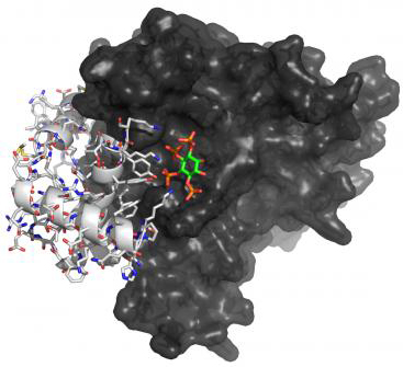 该图为组蛋白脱乙酰基酶3(暗灰色表面)的原子分辨结构,组蛋白脱乙酰基酶3是SMRT(亮灰色条状/带状)的及关键信号分子IP4(绿色/橙色条状)的辅助抑制物。(莱斯特大学)