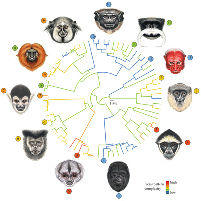 运用面部识别软件,研究人员描绘出了新大陆猴中129个猴种的面孔,并根据面部颜色的复杂性进行了排序。