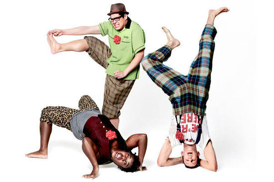 百老汇音乐剧《福音》中的演员展示他们的身体柔韧性。从左至右分别是乌佐•阿杜巴(轮式)、乔治•萨拉扎(举手抓大足趾式)和尼克•布拉米尔(头倒立式)。