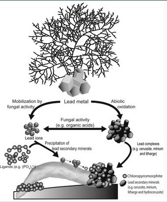 铅金属暴露在大气、湿度和pH中能够产生铅氧化物和铅盐。修复铅污染土壤的策略的着重点是将铅转化为最稳定形式的磷氯铅矿。已知真菌能够让诸如铀之类的其他毒性化合物去毒,去毒方式就是将它们转换为矿物形式。因此来自英国邓迪大学的Geoff Gadd推断真菌也可能对铅做同样的事情。
