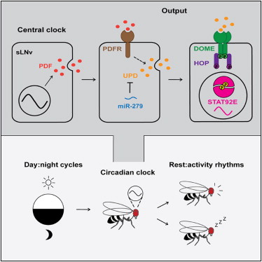 在缺失miR-279的生物钟起搏器神经元中PERIOD蛋白的正常波动表明,miR-279在这些生物钟神经元的下游发挥作用。研究小组鉴别出了JAK/STAT的配体Upd蛋白是miR-279的作用靶点。他们也正是敲除Upd可以逆转miR-279突变果蝇的节律失常行为。