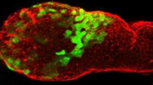 小鼠胚胎中所有细胞外膜发出红光。一小部分细胞表达发出绿光的蛋白意味着它们是指示头部发育的细胞。