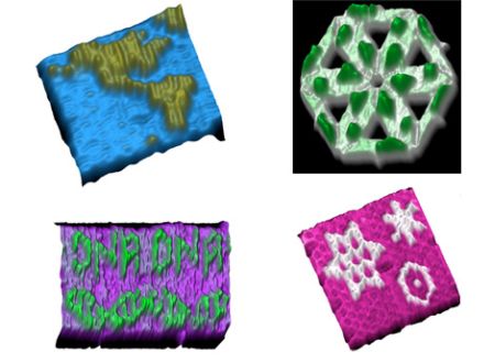 在2006年,Nature杂志就发文介绍了构建DNA纳米结构的新方法。这些研究人员构建的DNA纳米结构比以前任何时候所构建的都更大、更复杂。这种从下往上“一锅烩”的方法用几百个短的DNA链来将一个非常长的链像订书针那样钉成二维结构,可以做成任何想要的形状,如方形、“纳米脸形”和五角星形。各个“订书针”也可以进行改造,将其做成纳米尺度的像素,后者可用来在一个100纳米的给定形状上生成表面图案。