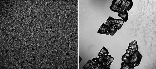 在有细菌存在时,碳酸钙成晶体形式(由),在无菌条件中为无定形态(左)