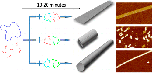 以此为切入点,研究人员又将多个DNA长方形结构单体进一步组装复杂结构。通过这种两步组装可折叠出DNA纳米带和纳米管结构。例如,在长方形单体上添加横向连接链,可获得由多个单体横向连接成的DNA纳米带。而当添加纵向连接链时,则得到了由单个长方形自身卷曲形成的纳米管结构。这种短纳米管连接起来则构成了一个长达100纳米以上,直径精确可控的DNA纳米管。令人惊讶的是,这些复杂纳米结构实际上可直接由DNA链用一步法直接快速组装出来,而不需要经过长方形单体的过度,这进一步证明了DNA结构组装过程中的高度协同性。