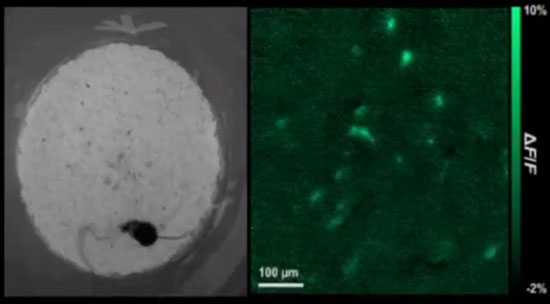 研究人员首先利用基因疗法令老鼠神经细胞表达绿色荧光蛋白,该蛋白对钙离子敏感。当神经元受到刺激时,细胞内充满钙离子,荧光蛋白被激活,整个细胞会发出明亮的绿色荧光,就像一朵灿烂的绿色小烟花在黑色背景下绽放。随后,研究人员在老鼠大脑负责空间和情景记忆的海马体上方植入一个微型显微镜,显微镜与相机芯片相连,并可将数字图片传送到电脑,在电脑屏幕上显示老鼠大脑活动的实时视频。