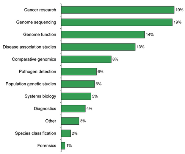 鉴于下一代测序的缺点,我们要求研究人员指出,他们在哪些研究领域利用下一代测序技术作为实验流程,这些应用领域列举如下图。